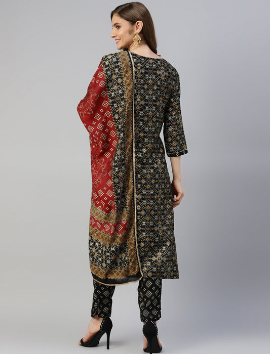 Ethnic Women Black Yoke Design Velvet Kurta Pant with Dupatta