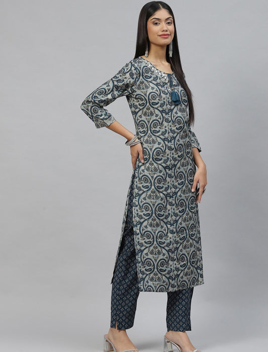 Grey & Navy Blue Ethnic Motifs Printed Kurta with Trousers & Dupatta Kurta Sets For Women