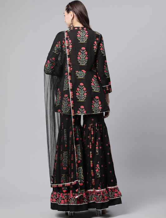 Black Floral Printed Pure Cotton Kurta with Sharara & Dupatta Kurta Sets For Women