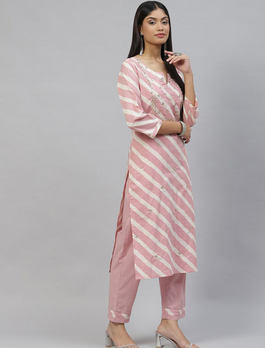 Ethnic Light Pink Leheriya Cotton Kurta Pant Set With Organza Dupatta