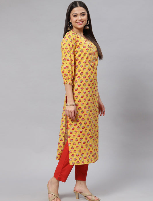 Yellow Ethnic Floral Cotton Kurta Pant Set with Dupatta