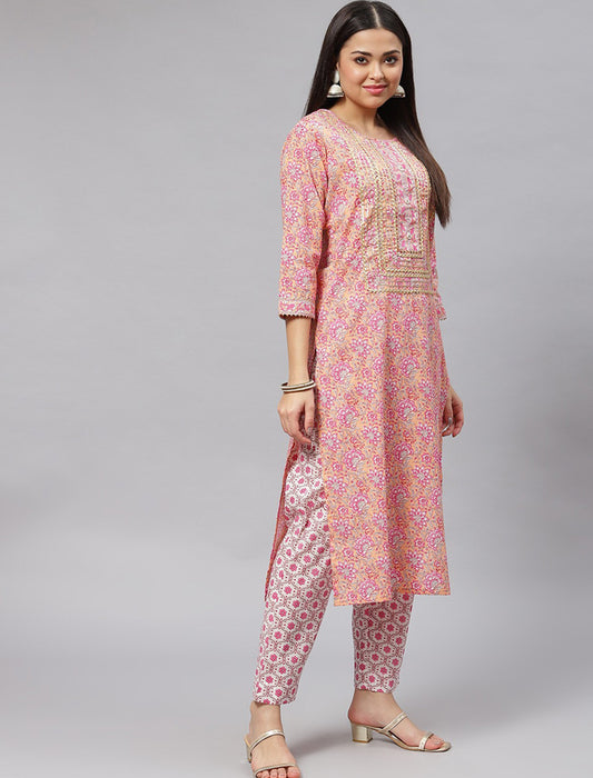 Peach Ethnic Pure Cotton Kurta Sets with Trousers For Women