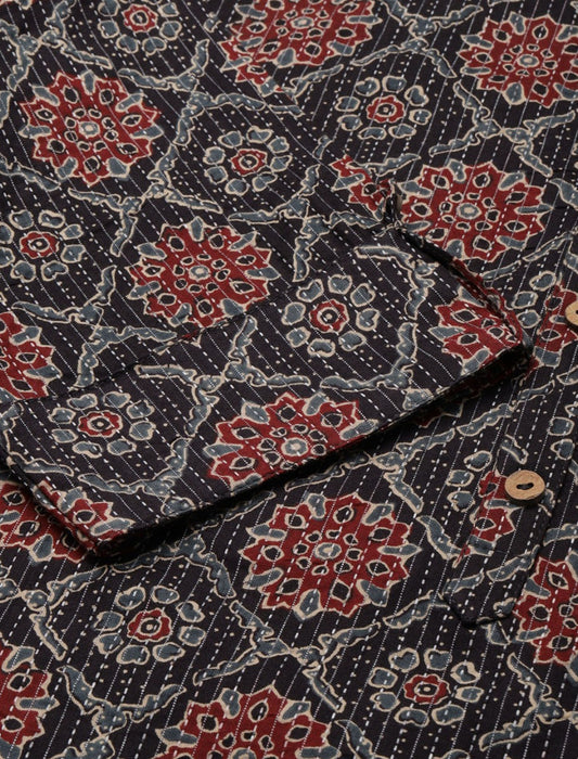 Black & Maroon Ethnic Motifs Printed Cotton Divena Kurta For Women