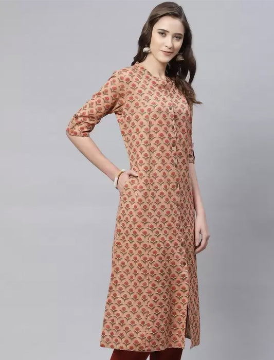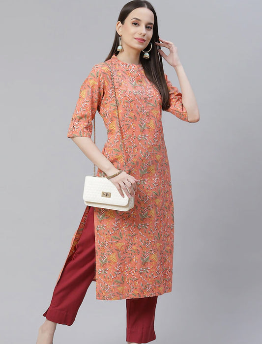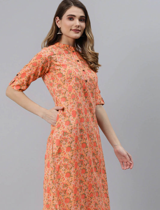 Peach Floral Printed Pure Cotton Ethnic Kurta For Women