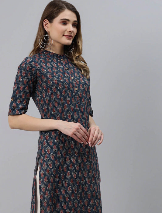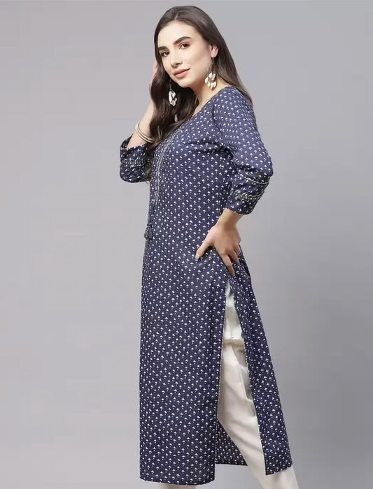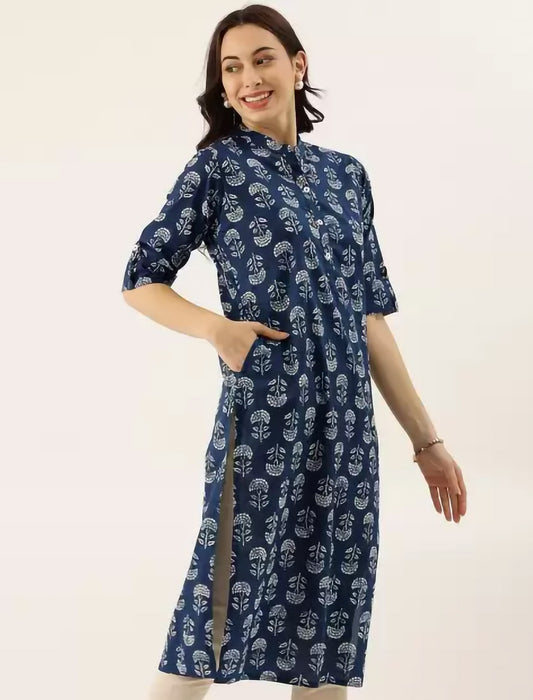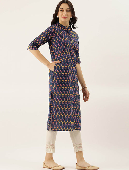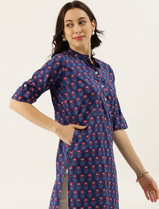 Navy Blue Printed Pure Cotton Ethnic Kurta For Women