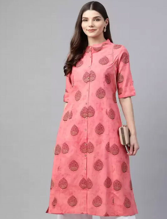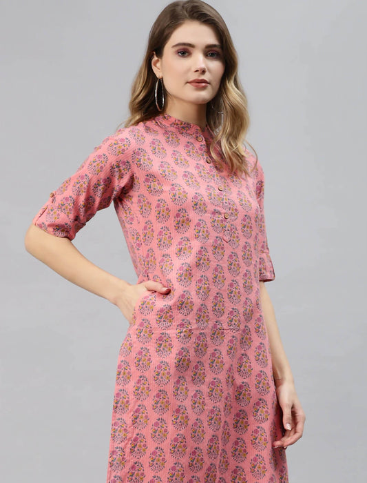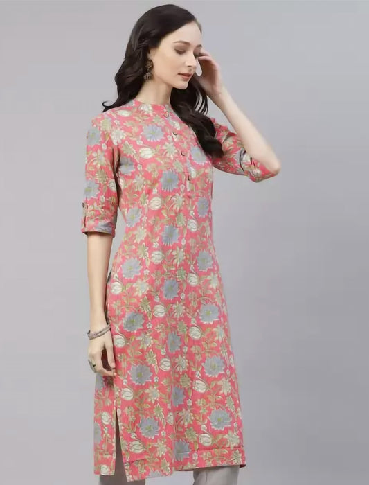 Pink Floral Printed Cotton Divena Kurta For Women