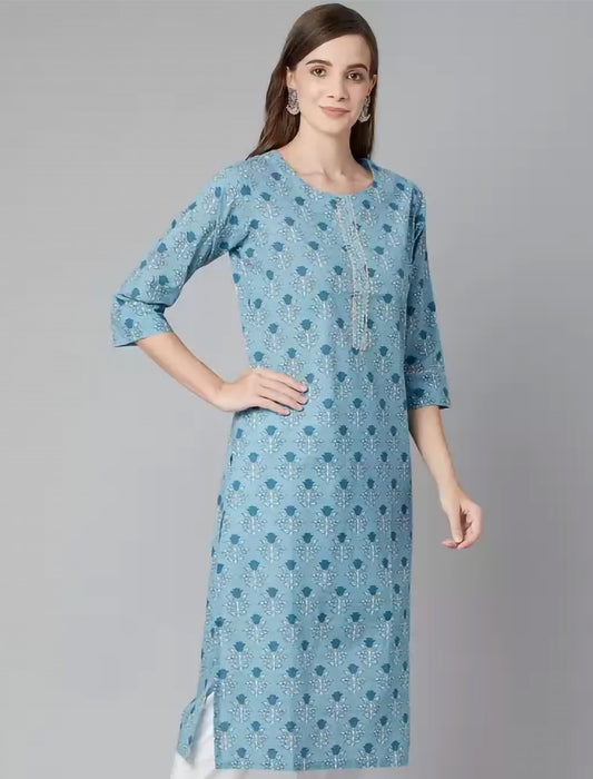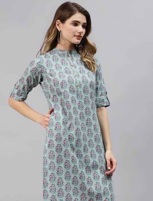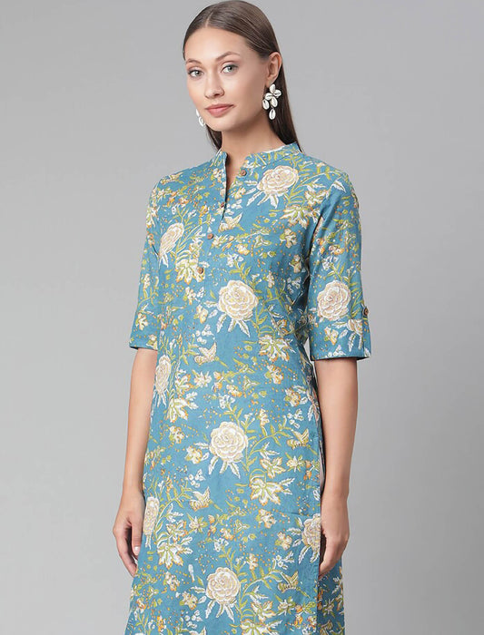 Teal Floral Printed Straight Divena Kurta For Women