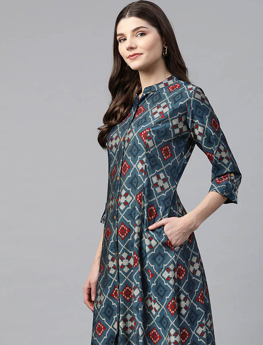Navy Blue Geometric Printed A-Line Ethnic Kurta