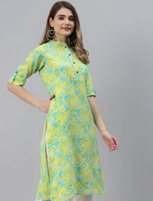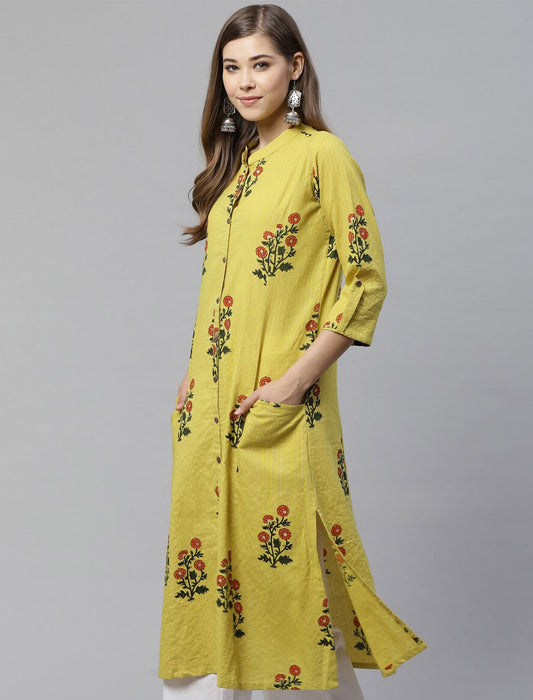 Yellow & Green Floral Printed Pure Cotton Divena Kurta For Women