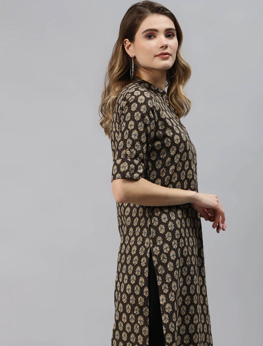 Black & Beige Ethnic Motifs Printed Cotton Divena Kurta For Women