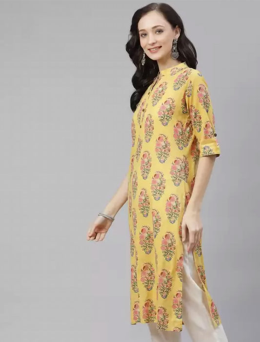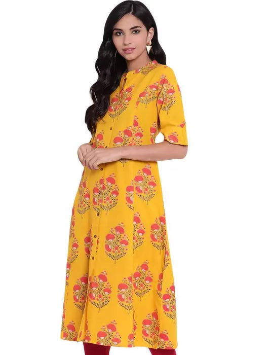Yellow Floral Printed Cotton Divena Kurta For Women