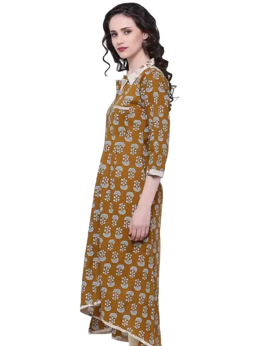 Mustard Yellow Printed Khadi Cotton A-line Divena Kurta For Women