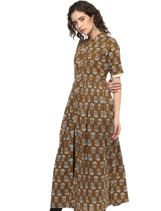 Brown Printed Cotton Blend Front Slit Divena Kurta For Women