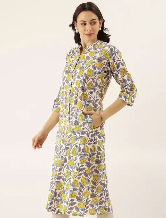 White & Yellow Ethnic Motifs Printed Ethnic Kurta For Women