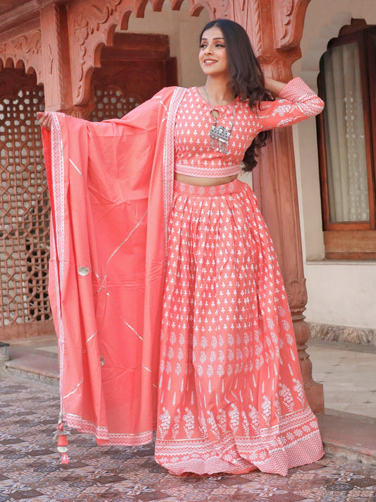 Plus Size Pink Printed Crop Top, lehenga with Dupatta set