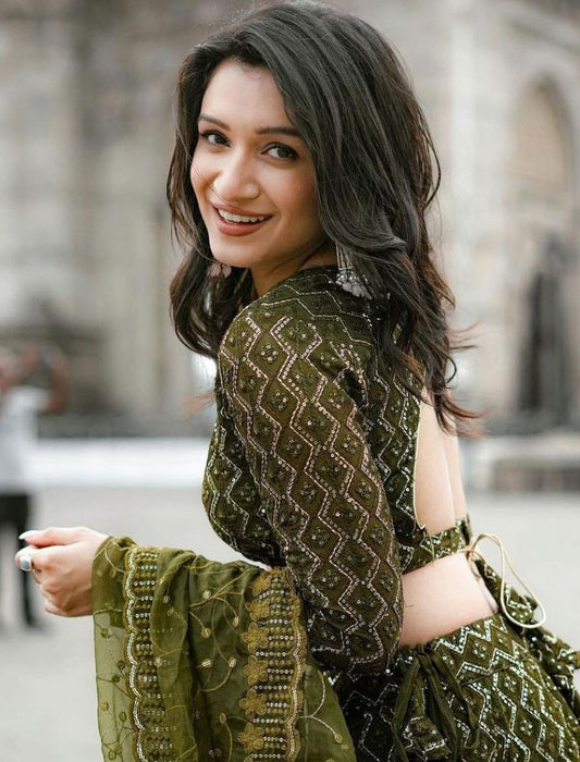 Olive Green Fox Georgette Semi-Stitch Ethnic Lehenga Choli And Net 3 MM Sequence Work With Inner Crepe