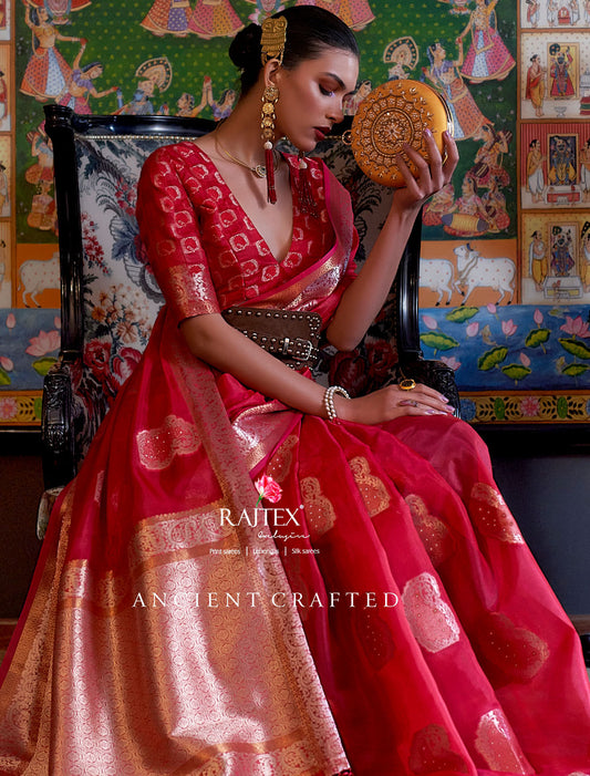 Two Tone Red Organza Handloom Weaving Designer Saree