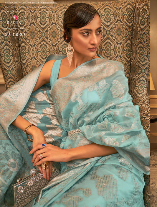 Blue Organza Sequins Handloom Weaving Desginer Party Wear Saree
