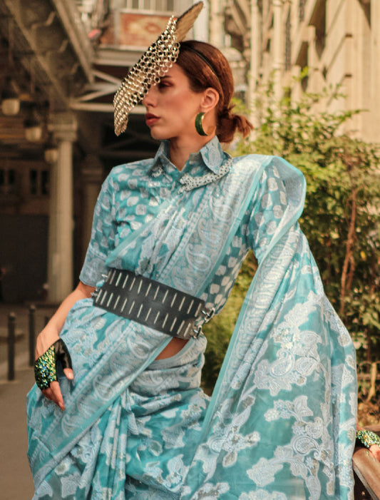 Organza Lucknowi Chikankari Zari Handloom Weaving Regal Charm Women Saree