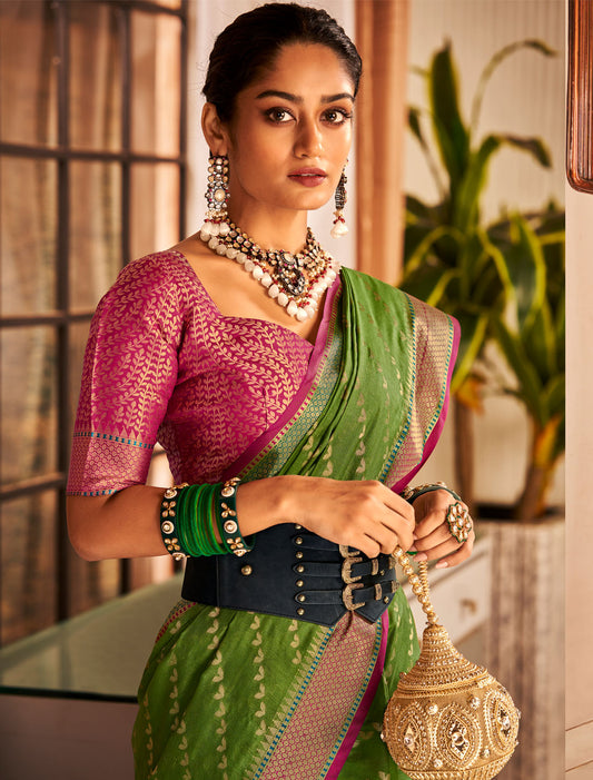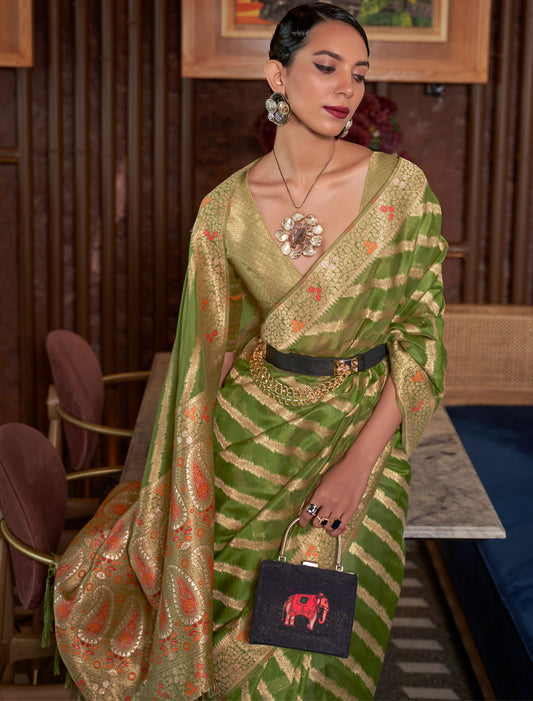 Opulence Khadi Georgette Nylon Handloom Weaving Ethnic Olive Green Saree For Women