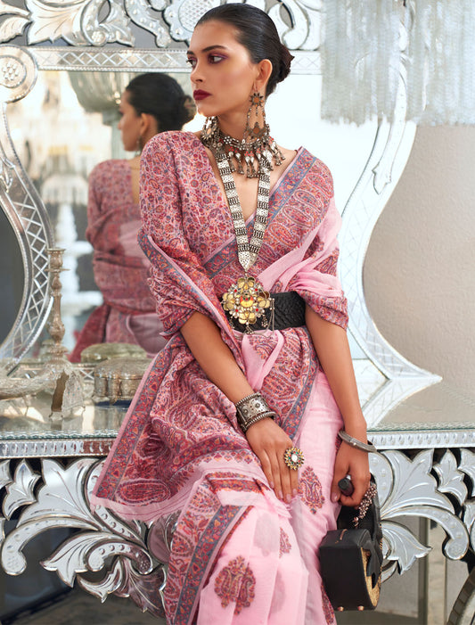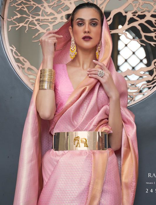 Khadi Timeless Beauty Georgette Nylon Handloom Weaving Ethnic Pink Saree For Women