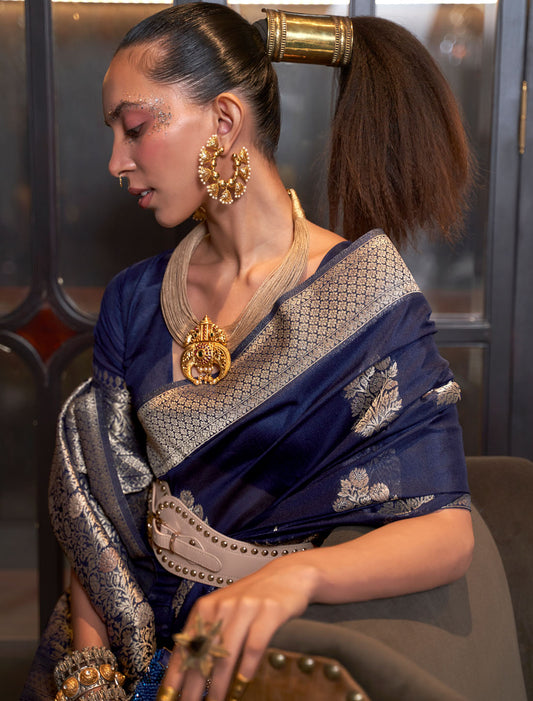 Handloom Harmony Khadi Georgette Nylon Weaving Ethnic Navy Blue Saree For Women