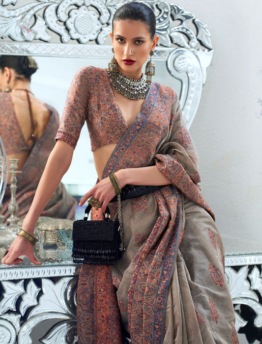 Radiance Ethnic Khadi Georgette Nylon Handloom Weaving Brown Saree For Women