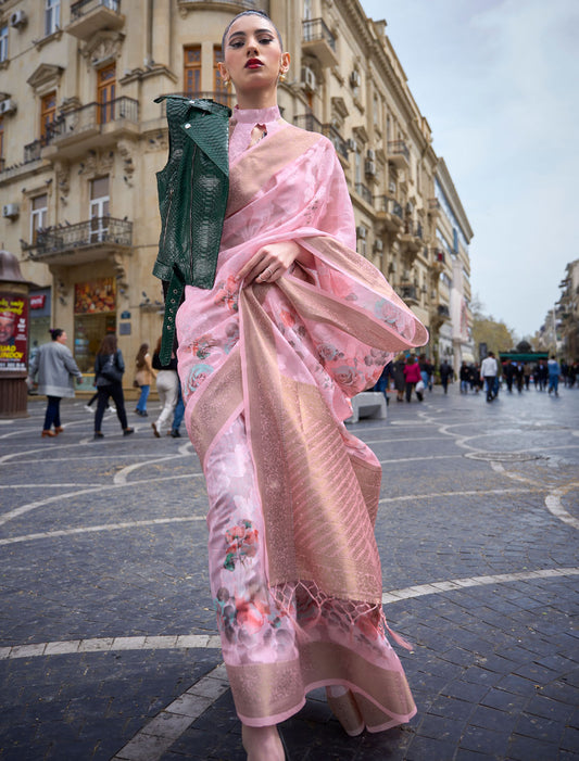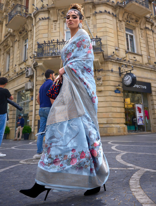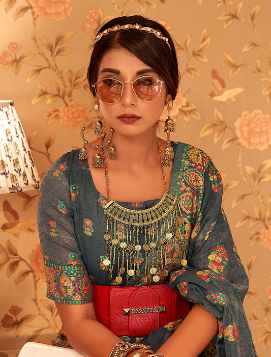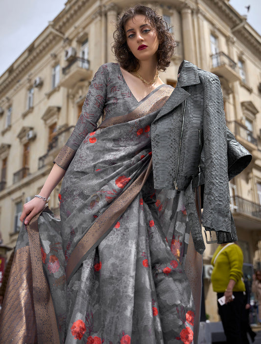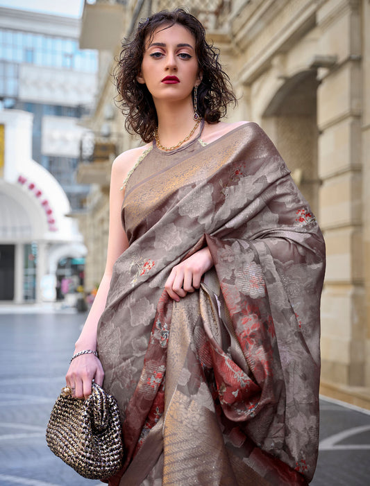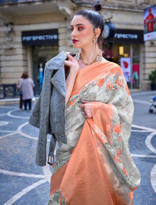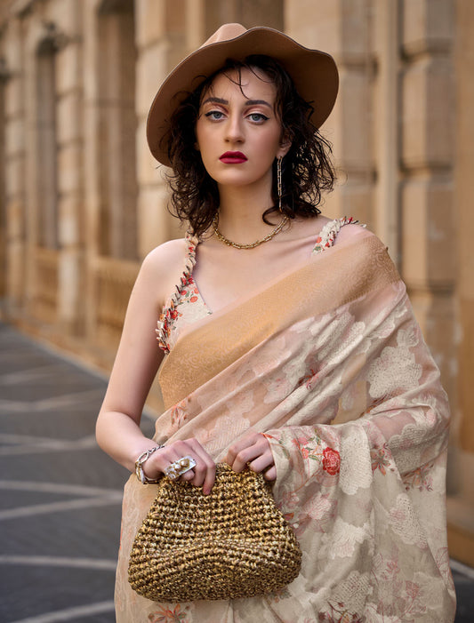 Elegance in Bloom: Digital Satin Crepe Saree with Blouse for Evening Soirees