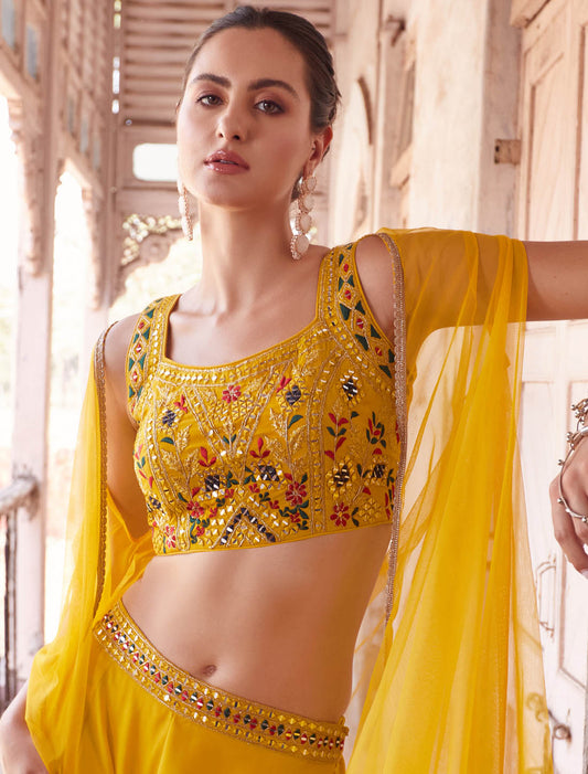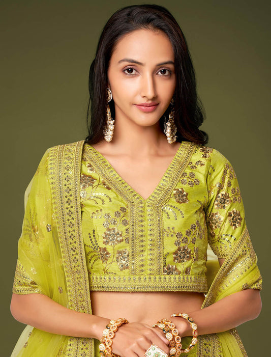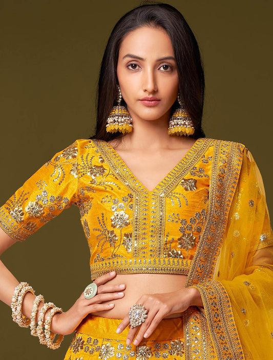 Yellow Semi Stitched Ethnic Wedding Lehenga Choli For Women With Slub Silk Fabric & Sequins Embroidery Work