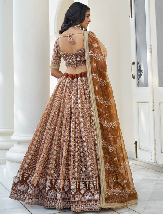 Brown Semi Stitched Party Wear Wedding Lehenga Choli For Women Butterfly Net Intricate White Thread & Sequins Embroidery Work