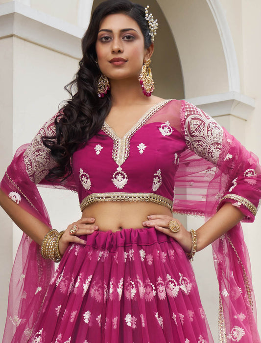Dark Pink Wedding Semi Stitched Lehenga Choli for Women Party Wear With Butterfly Net & Elegant White Thread & Sequin Embroidery Work
