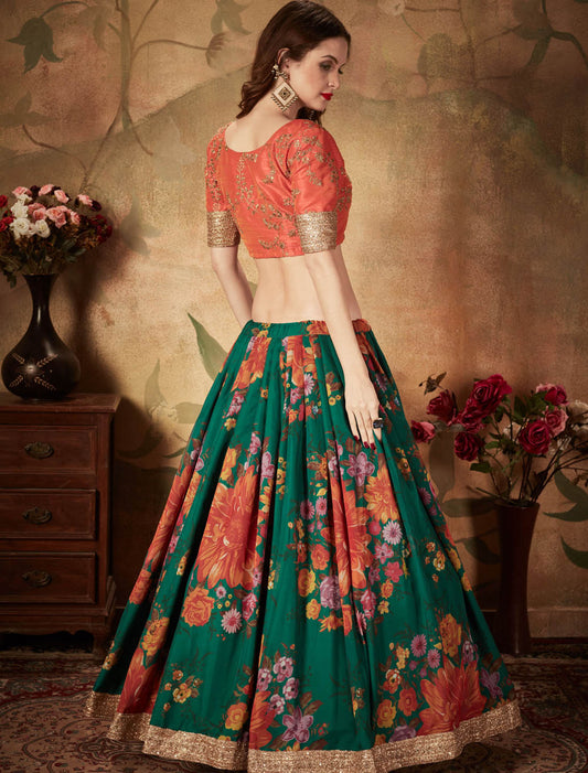 Green & Orange Organza & Slub Silk Ethnic Lehenga Choli With Digital Print For Women