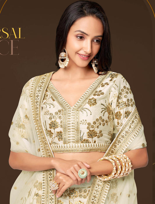Ivory Semi Stitched Party Wear Wedding Lehenga Choli For Women With Butterfly Net & Embroidery
