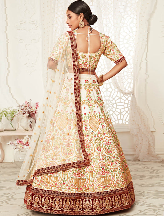 White Ethnic Semi Stitiched Wedding Lehenga Choli For Women With Slub Silk Fabric