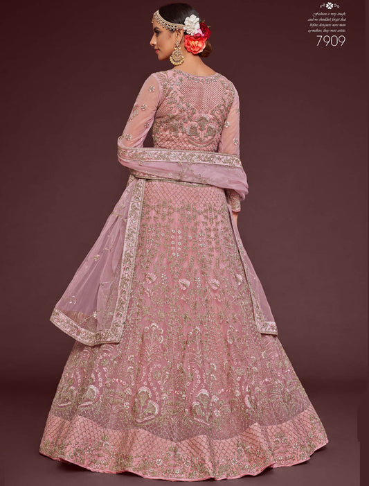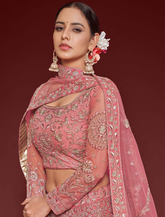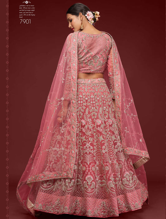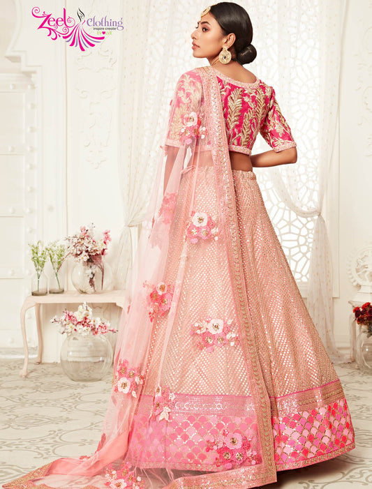 Pearl Pink Semi Stitched Women Ethnic Lehenga Choli For Wedding With Soft Net Majestic Flair Glitter Embroidery Work