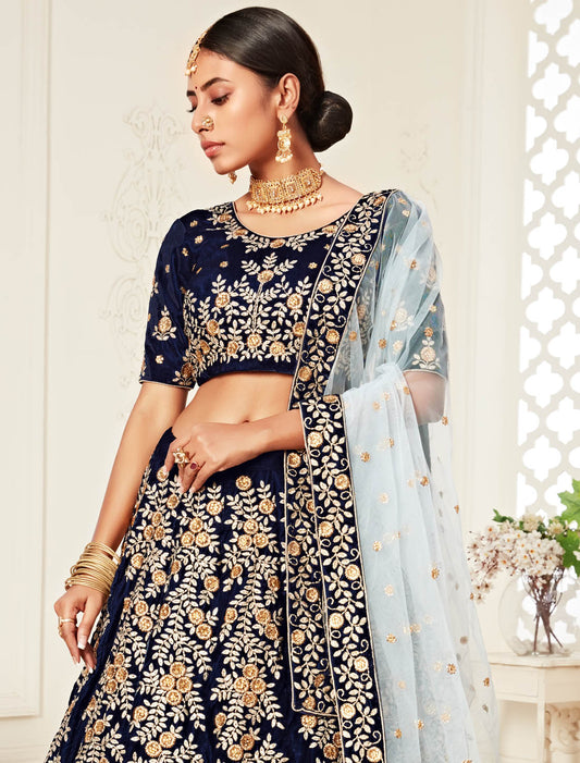Navy Blue Women Exquisite Elegant Lehenga Choli For Wedding with Velvet & Soft Net Dupatta