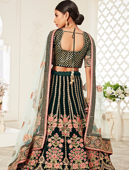 Green Velvet Ethnic Wedding Semi Stitched Lehenga Choli For Women with Soft Net Dupatta