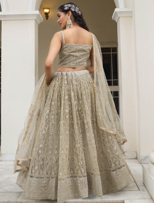 Light Blue Gray Women Semi Stitched Lehenga Choli For Weddng & Party Wear With Butterfly Net & Inner & Dupatta Tone-to-Tone Embroidery