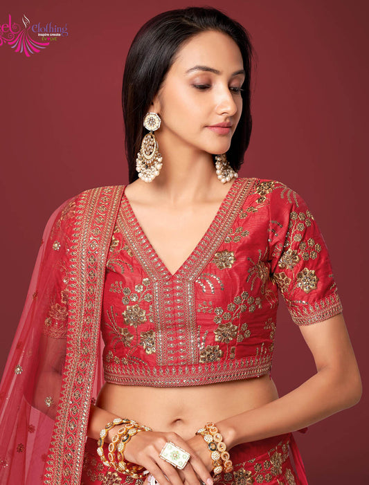 Red Slub Silk Ethnic Semi Stitched Wedding Lehenga Choli For Women with Sequins Embroidery Work