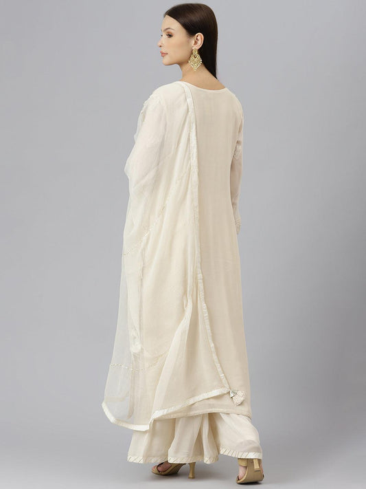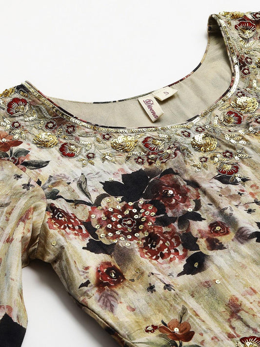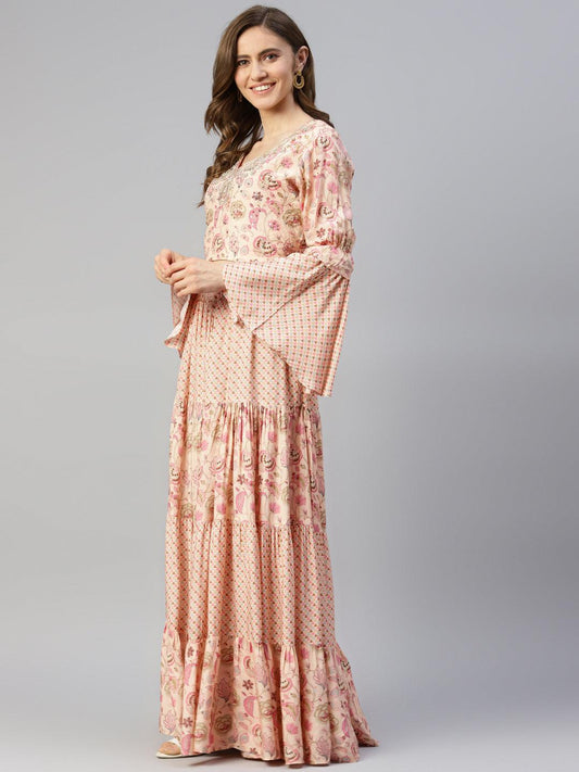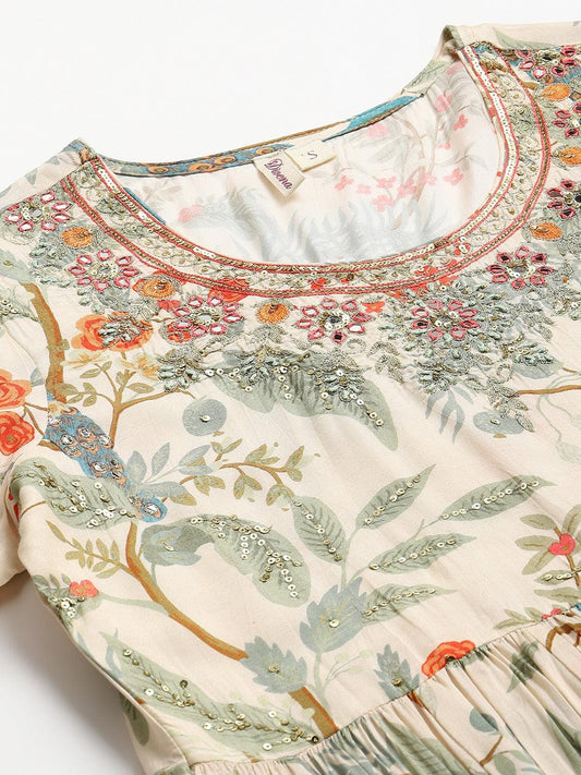 Party Wear Ethnic Cream Floral Printed Muslin Flared Gown