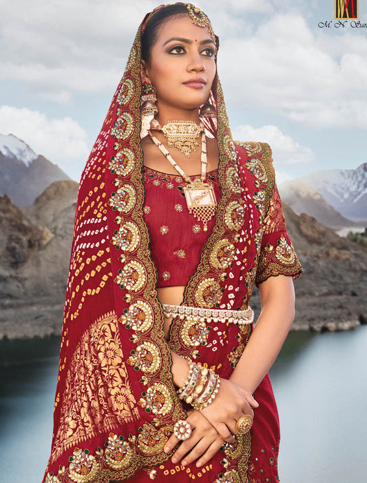 Maroon Pure Gajji Bandhej Satin With Real Silk Blouse Original Mirror Moti & Cut Dana Work Traditional Wear Sarees
