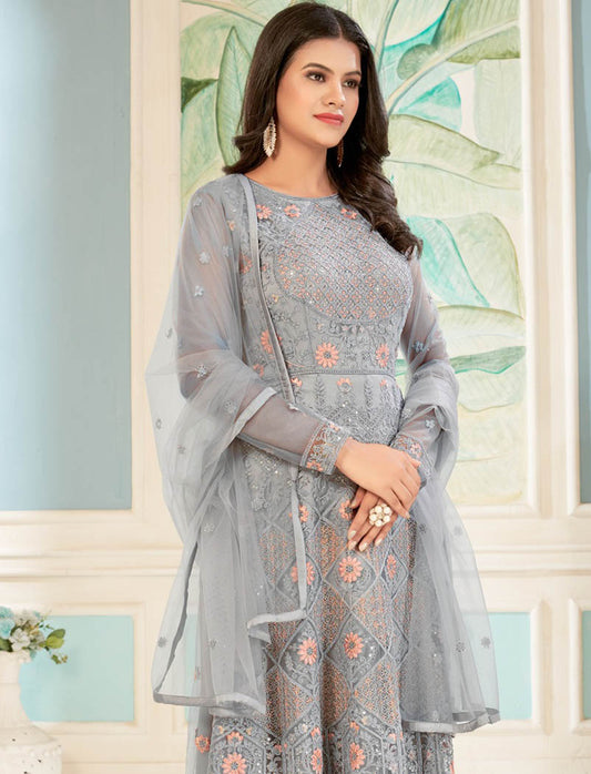 Grey Semi Stitched Designer Work Long Salwar Kameez For Women