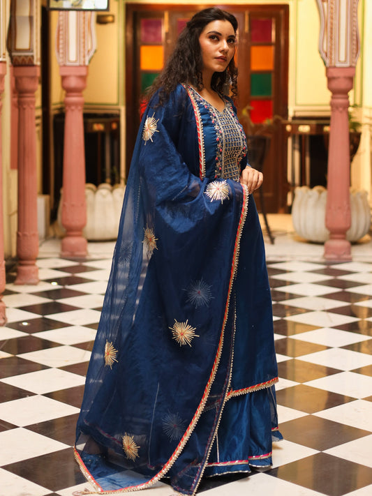 Divena Blue Solid Chenderi Kurta Skirt Set with Dupatta