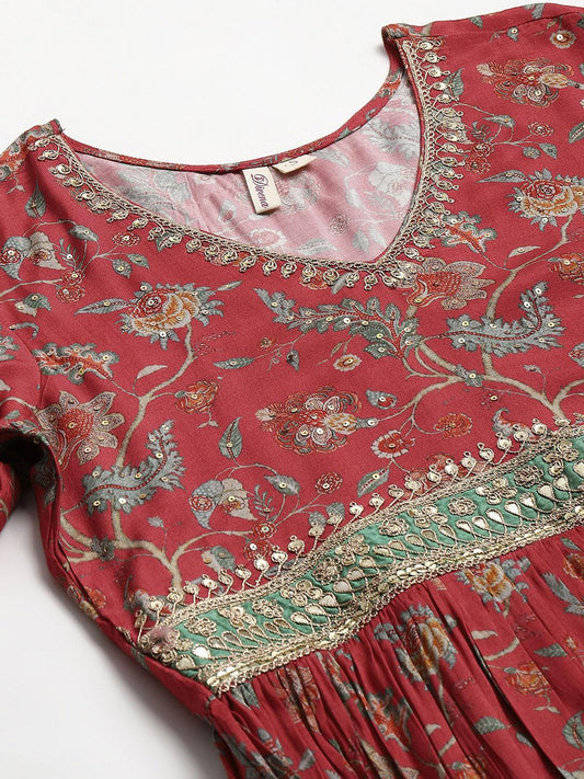 Ethnic Party Wear Maroon Floral Printed Muslin Flared Gown