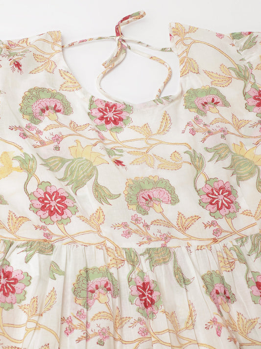 Handblock Floral Printed Beige Anarkali Cotton Kurta Set, Trousers & Dupatta