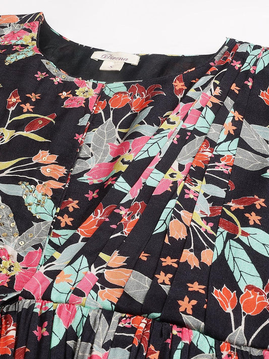 Navy Blue Floral Print Cotton Kurta Set Trouser With Dupatta