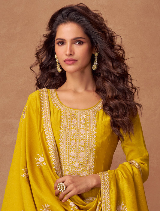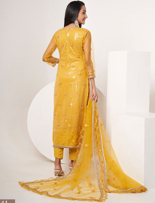 Yellow Women Ethnic Semi Stitched Salwar Suit Wtih Thread Work Sequence Embroidery