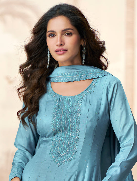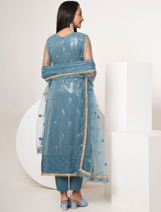 Blue Butterfly Thread Work Ethnic Semi Stitched Women Salwar Suit With Sequence Embroidery