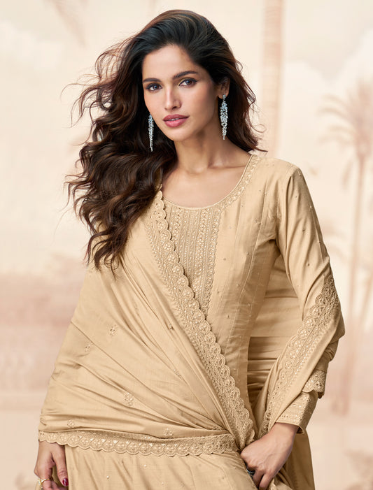 Beige Premium Silk Free Size Designer Party Wear Gown For Women
