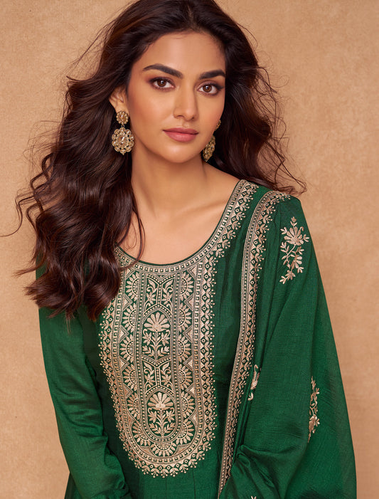 Green Ethnic Print Chanderi Silk Straight Kurta Set
